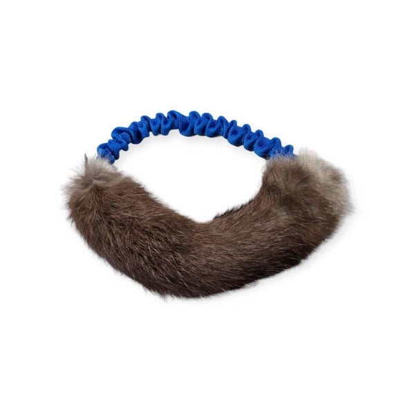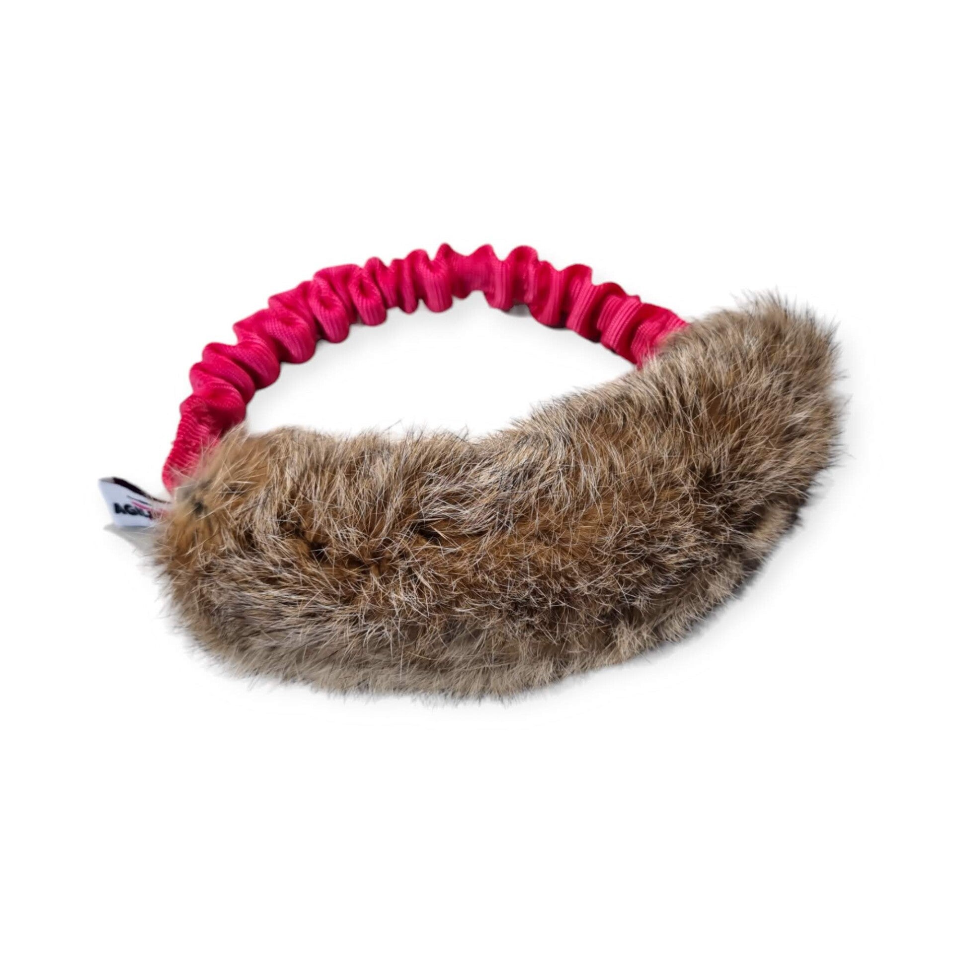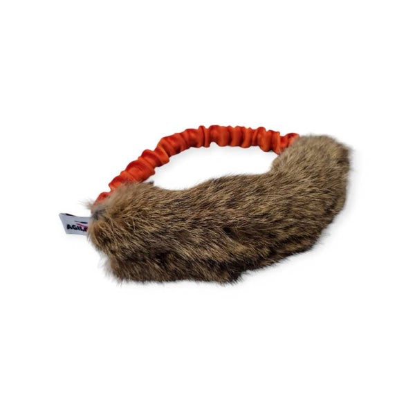 This Agilitoy has a round handle with bungee and a rabbitskin-covered bite-area.