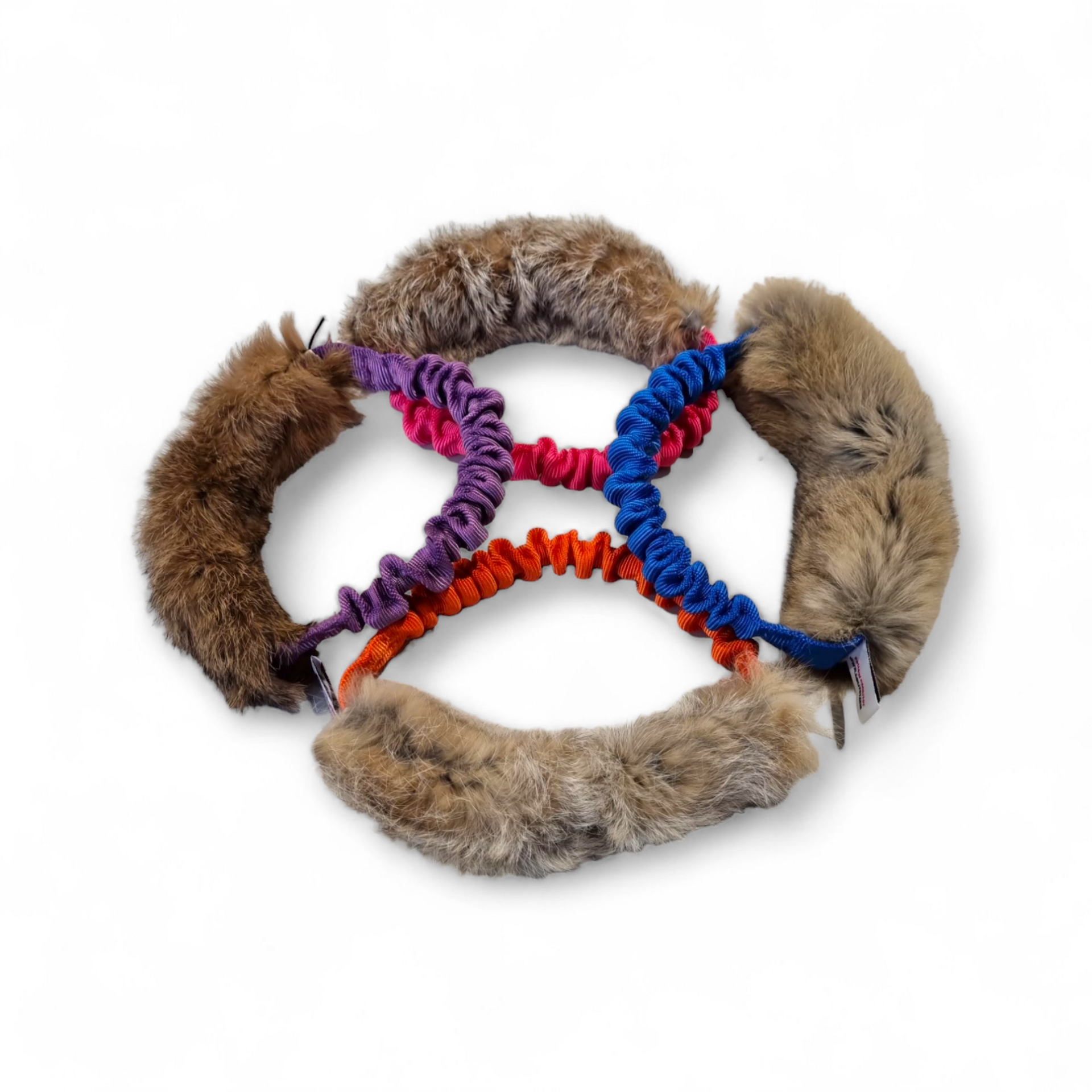This Agilitoy has a round handle with bungee and a rabbitskin-covered bite-area.